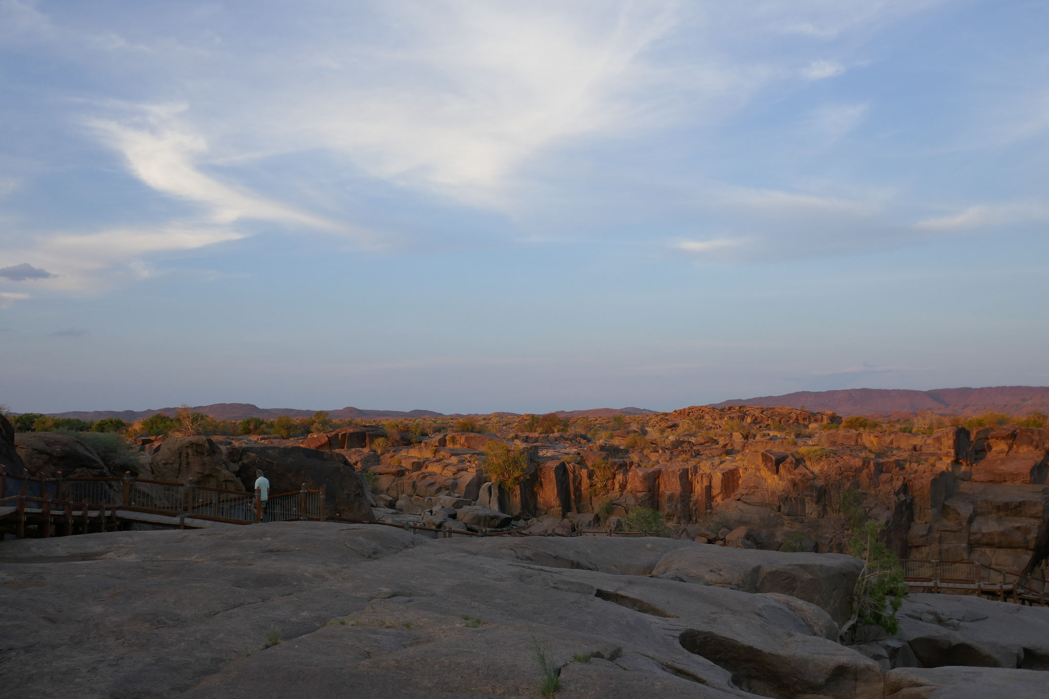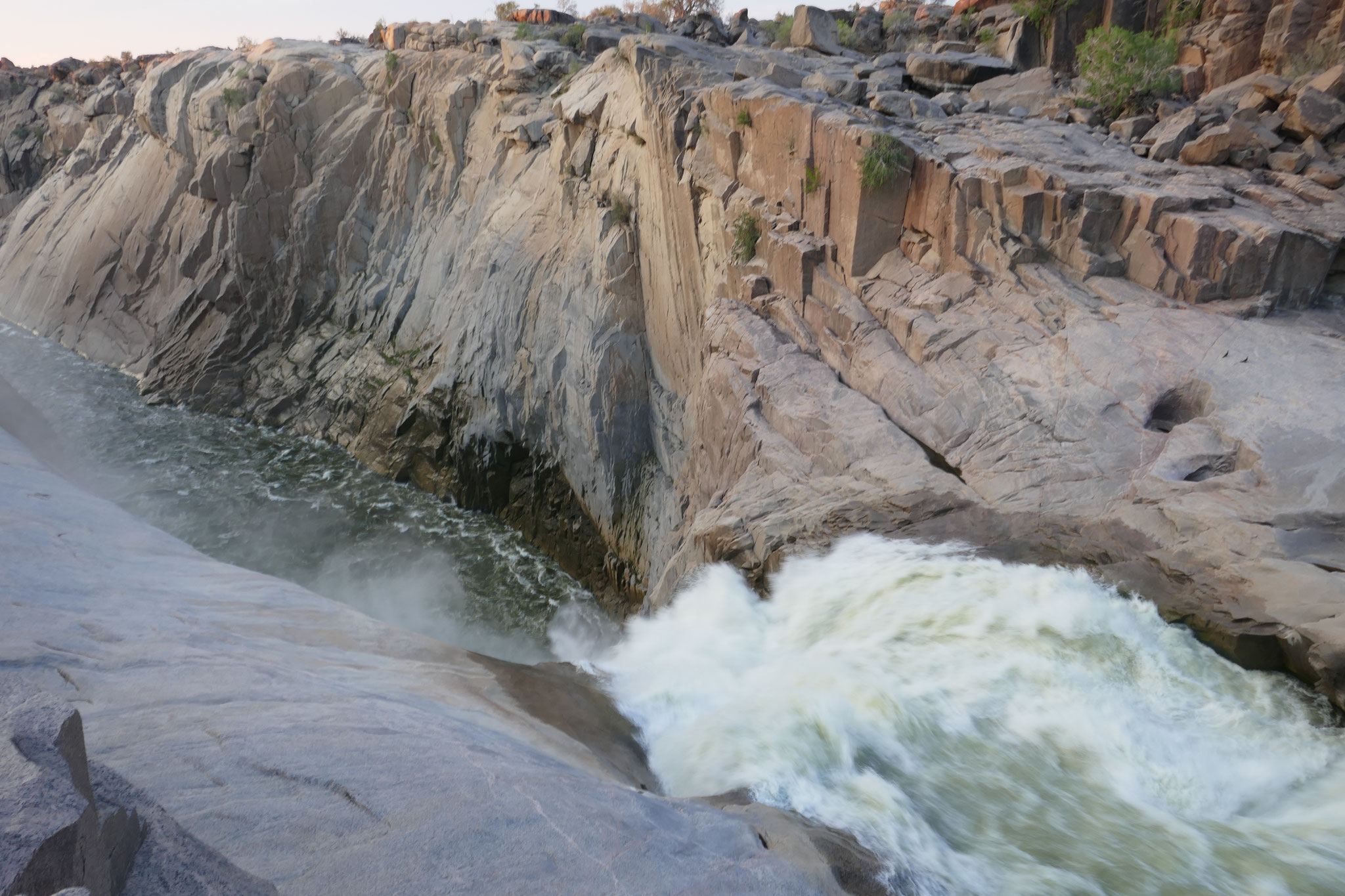 Gegen Abend gehen wir über die schön angelegten Stege über die Felsen zu fünf Aussichtspunkten hoch über der Schlucht und dem Wasserfall. Sieht schon beeindruckend aus, zusammen mit dem Donnern der Wassermassen, die da permanent runterstürzen. Aber bei weitem nicht die Wassermassen, die auf den Hochglanzfotos zu sehen sind. Dazu hat es in dieser Regenzeit einfach zu wenig geregnet. Erst nach 21.00 Uhr gehen die Temperaturen von 40 Grad ganz langsam etwas zurück. Zwischen den Felsen spielen überall Dassies, schwanzlose Bergkaninchen, unwahrscheinlich süß anzusehen. Die Dassies gucken uns mindestens so neugierig an wie wir sie, ein lustiges Schauspiel.