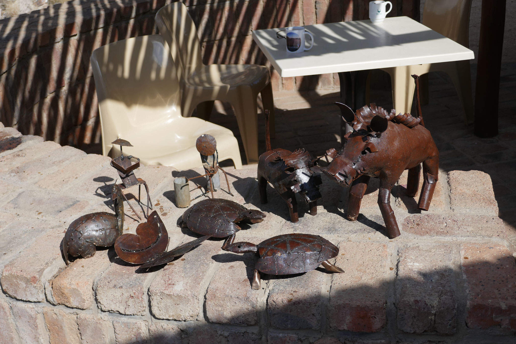 Auf der Herfahrt haben wir Station in Pofadder gemacht. Armseliges Nest, nicht der Rede wert, aber: im Vorbeifahren entdecken wir einen großen Platz voll mit Figuren aus Eisenblech. Da schlagen sofort zwei Herzen höher, wir halten an, schauen uns um und hoffen, am Ende in Johannesburg alles im Gepäck verstauen zu können. Das Thema bleibt bis zum letzten Tage spannend. Aber wir konnten einfach nicht widerstehen.