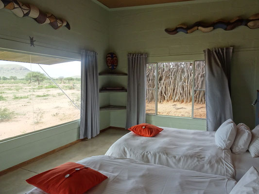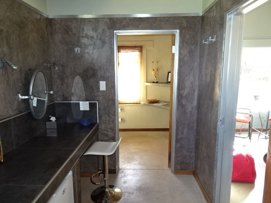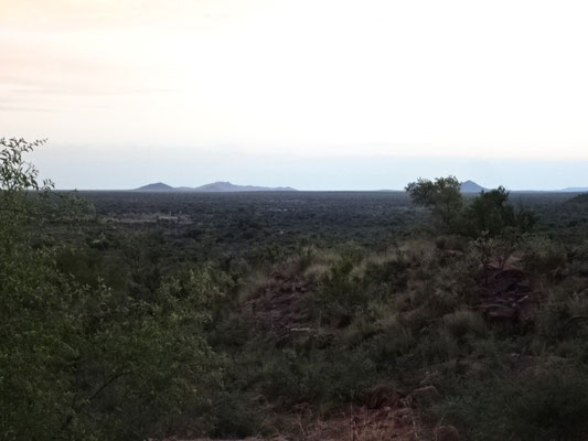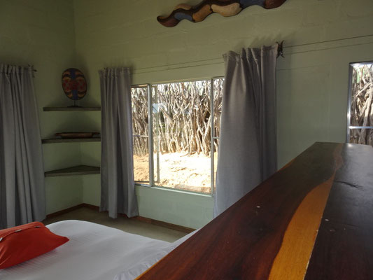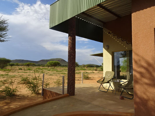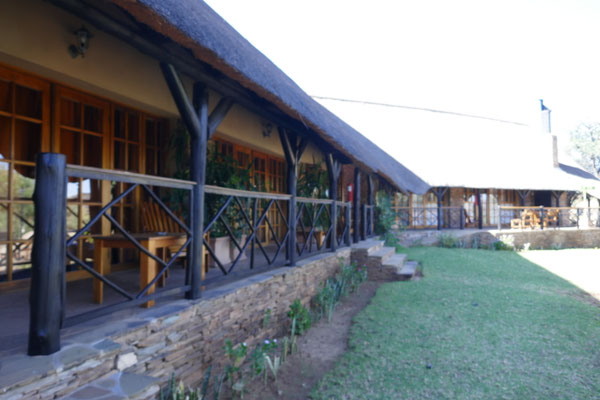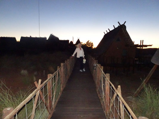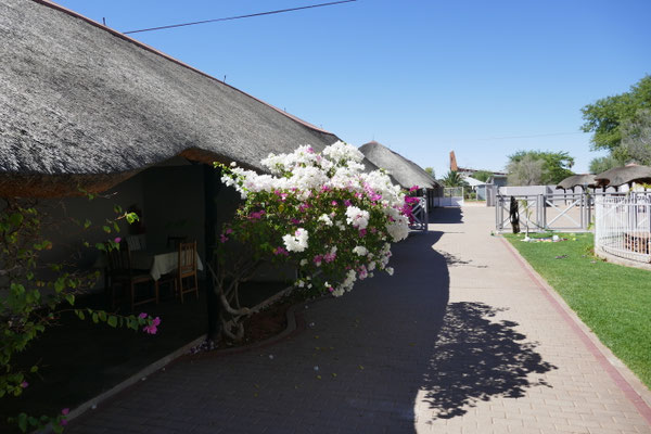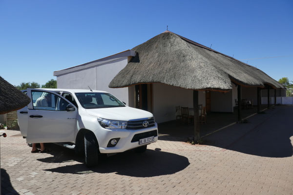 Die Ferienanlage ganz in der Nähe der Stadt Rehoboth gehört einer Gesellschaft mit 57 Anteilseignern und ist das einzige "Black Economic Enpowernment" Projekt im namibischen Hotel- und Gaststättengewerbe. Im Rahmen dieses Programmes wurden Schwarzen nach dem Ende der Apartheit zinsgünstige Kredite gegeben, damit sie sich ein eigenes Leben aufbauen konnten. Alles in schwarzer Hand, freundlich, engagiert, aufmerksam. Und dazu leckeres Essen mit Filets vom Onyx, Gnu und Kudu. Die Unterkünfte weit vertreilt über ein grosses Gelände. Wir bewohnen eines von sechs aneinandergereihten Familienzimmern, alle anderen unbewohnt. In der Nacht kommen fünf Zebras auf den Rasen vor der Verandatür und fressen den Rasen kurz, lautlos, immer wieder aufmerksam die Umgebung sichernd.