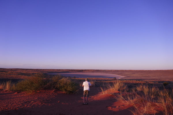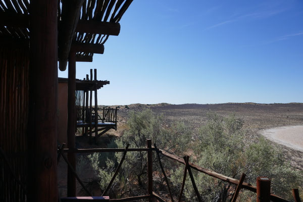 Wir fahren hinter dem Toyota her, der zur Abholung gekommen ist. 90 Minuten durch die Dünen, klappt gut im 4 x 4 high Modus. Die !Xaus Lodge ist großartig gelegen, oberhalb einer grossen Salzpfanne auf einem Dünenkamm. Das Brauchwasser kommt aus 120 m Tiefe und ist salzig, das Süßwasser wird über reverse osmose aufbereitet. Das Brauchwasser, obwohl salzig, ist total weich.