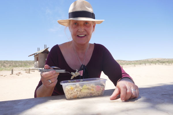 Wir stehen 5.00 UIhr bei eiskalten 22 Grad auf und fahren 6.00 Uhr zur Erkundung der Umgebung los. Giraffen ganz nah, majestätisch, mit langem Hals auf der Suche nach den zartesten Blättern. Streifenhörnchen beim Spielen, miteinander Kämpfen, könnte ich mir stundenlang ansehen. Am frühen Morgen kommen die Konturen in der Landschaft so viel besser raus als im vollen Mittagslicht. Für den morgigen Reisetag bereitet Ruth einen Nudelsalat vor, brauchen wir immer einmal auf der Reise. Allerdings mit Essig und Öl statt mit Mayonnaise.