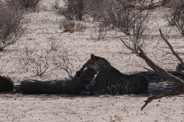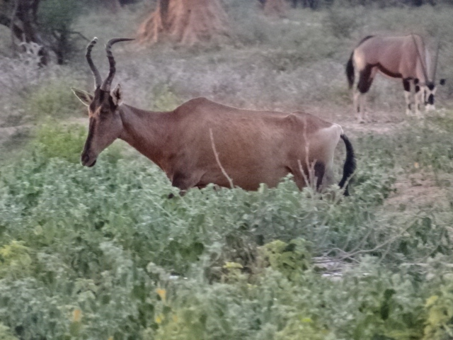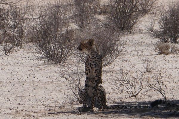 Kein Handyempfang, kein Internet, dafür viel unberührte Umgebung. Der spärliche Bewuchs der Kalahari reicht aus, die Dünen zu stabilisieren. Sie wandern deshalb nicht mehr. Deshalb: Halbwüste. Auf der Abend Pirschfahrt sehe ich das Kahahari Kanguru, ein vielleicht 30 cm langes Tier, das sich tatsächlich wie ein Kanguru vorwärtsbewegt, mit 2 - 3 m weiten Sprüngen und nur in der Nacht rauskommt. Kaum sehen wir in der Ferne einen Leoparden, da ist er schon wieder in der Dunkelheit verschwunden.
