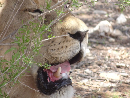 Hurra! So viele Tiere sind zu unserem Empfang gekommen und haben die Piste bei unserer 3,5 stündigen Anfahrt gesäumt. Kaum zu glauben! Zwei Löwen und eine Löwin sitzen unter einem Baum. Na ja, den Löwen hat das Leben gezeichnet: Ein Zahn fehlt, ein Auge ist blind. Aber immer noch eine imposante Erscheinung. Wenig später zwei Geparden etwas entfernt unter einem Baum, gelangweilt, elegant.(Ruth: leider war zu dieser Zeit meine Kamera nicht einsatzfähig: Batterie leer, unverzeihlich! Aber: wir werden später noch welche sehen und fotografieren!)). Eine Großfamilie Strauss stolziert durch den ausgetrockneten Aoub und hat viele Junge im Schlepptau. Giraffen recken sich hoch nach den zartesten Blättern. Und, und, und. So viel hatten wir selten an einem Tag zu bestaunen! Im Camp sind wir zum zweiten Mal. Von der Tränke unten im Flußbett kommen drei Löwen zu einem Baum unterhalb unseres Zeltes hoch und räkeln sich im Schatten. Schön zu beobachten. Das sind wohl die Löwenbabies, die wir vor zwei Jahren im Camp am gleichen Ort gesehen hatten. Mittags 38 Grad, 17.00 Uhr immer noch 37 Grad. Wir haben uns an die Wärme gewöhnt und einfach ein paar Gänge runtergeschaltet. Am Himmel ziehen Regenwolken auf, aber es bleibt trocken. Der Wind frischt auf, angenehm. Wir schmeissen den Grill an und legen das mitgebrachte Fleisch drauf. Ein Genuss.