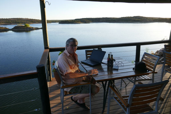 Die Architektur ist toll! Eine gelungene Mischung von Moderne (Beton, Ytongsteine, Stahl, viel Glas) und Tradition (Kunst aus der Region, regionale Hölzer, angepasste Farben). Wir brauchen etwas Zeit, um das alles mit dem Auge zu erfassen und das dann für uns einzuordnen. Diese Mischung hatten wir bislang noch nicht. Nach einem Tag sind wir so begeistert, dass wir einen Tag länger bleiben. Wir haben das Oryx Filet am Abend genossen, schön angerichtet, freundlicher, aufmerksamer "schwarzer" Service. Das gilt auch für den Empfang usw. Nach der Erfahrung am Hardap Staudamm nun hier schon die zweite gute Erfahrung mit Schwarzen im Hotel- und Gaststättengewerbe. In Namibia. In Südafrika haben wir solche Erfahrungen nicht gemacht.