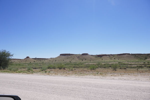 Die Schotterstrasse C 15 führt uns über 200 km durch das ausgetrocknete Bett des Auob Flusses. Karge Landschaft, selten mal eine Farm. Im Flussbett wird Holzkohle hergestellt. Witzig in einer Umgebung, in der doch so wenig wächst. Höchstgeschwindigkeit 100 km/h, mehr ist auch nicht empfehlenswert, fühlt sich an wie auf festgefahrener Schneedecke.