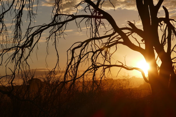 6.00 Uhr Morning Drive statt Morning Walk, denn die Tiere sind unruhig, frische Löwenspuren ums Camp, aber keiner hat die Löwen gesehen. Da wollen die Führer nicht zu Fuß raus und eine überraschende Begegnung riskieren. Viel Info über den Nutzen der Pflanzen für den Buschmann und immer wieder Begegnungen mit Oryxen, sehen wunderschön aus. Später Ausflug zu einem nachgebauten San-Dorf. Mit einfachen Mitteln wird die Herstellung von Kleinkunst demonstriert. In klassischen Ledershorts, die sonst keiner mehr trägt. Alles recht künstlich, gequält, na ja. Abends dann noch ein Sunset Drive mit dem in diesen Breitengraden üblichen beeindruckenden Sonnenuntergang. Und wieder keine Löwen gesehen, wohl aber ihre frischen Spuren. Wir sind nur zu viert in der Lodge und lösen mit Roy und Barbara aus Wien bis spät in die Nacht die Probleme dieser Welt. Ein toller Kontakt, der Abend hat Spaß gemacht.