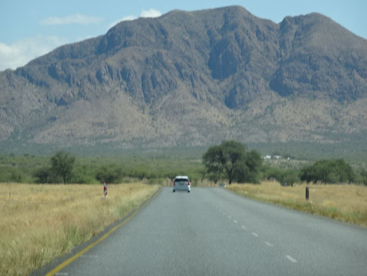 Wir sind auf der B 1 durch Windhuk durchgefahren und gut in dem privaten Naturpark angekommen. Vor zwei Jahren gab es noch keine Autobahnen in Namibia, jetzt die die B 1 einige Kilometer von Windhuk nach Norden schon zur A 1 Autobahn geworden. An den Baustellen sehen wir PKW und LKW mit chinesischen Aufschriften.