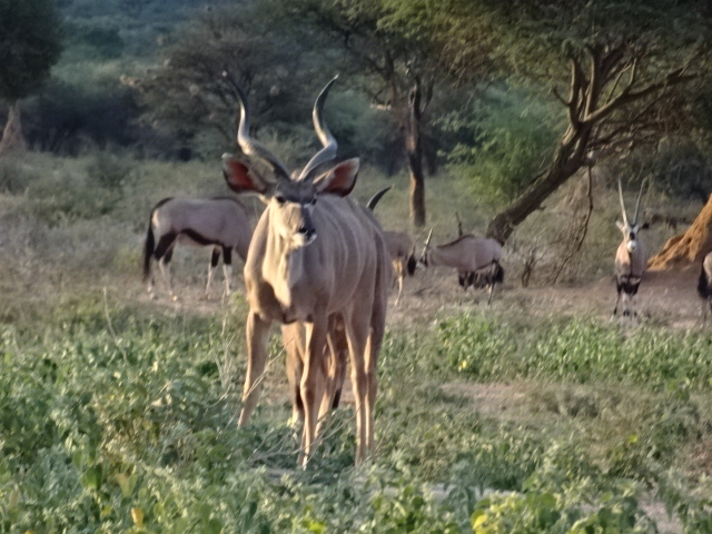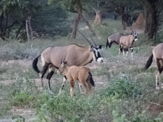 5.30 Uhr aufstehen, eine Tasse Kaffee oder Tee trinken und dann ab zum Morning Drive. Mit auf dem Wagen vier junge, kichernde Namibierinnen. Unter einer Ansammlung von Altholz finden wir nach längerem Suchen eine Leopardin mit ihrem Jungen, vielleicht zwei Tage alt. Die Leopardin zieht sich schnell weiter in ihr Versteck zurück, das Junge können wir eine zeitlang beobachten, ein einmaliger Anblick! Die Mutter muss jetzt aufpassen, dass sie das Junge vor Geparden, Hyänen und anderen Raubtieren schützt und trotzdem ausreichend Beute macht. So ca. 18 Monate wird das Junge von ihr abhängen. Eine Herde Kudus grast ganz in der Nähe und hat auch Junge. Potenzielle Beute für die Leopardin. Etwas weiter treffen wir auf einen Leoparden, der sich aber bald erhebt und von dann abmarschiert, er möchte nicht gestört werden. Im Gegensatz zu den Naturschutzgebieten dürfen die Safarifahrzeuge in den privaten Naturparks von den Wegen abweichen und auch querfeldein fahren, immer mit entsprechener Rücksicht auf die Tiere. Ohne Querfeldeinfahrt hätten wir die Leoparden nicht erlebt.