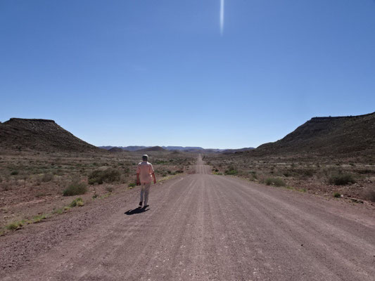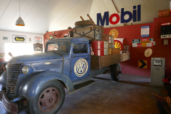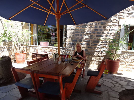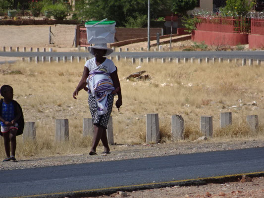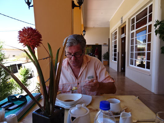 Wir fahren einen kleinen Umweg über Helmeringhausen. Im Krämerladen bekomme ich mit der Visa gegen 5 % Gebühr Bargeld. Tankstelle, Hotel und eine Ansammlung von Häusern. Helmeringhausen Hotel wirkt wie eine Oase in der Wüste. Ein Relikt aus der Zeit 1885 bis 1915, die Zeit der deutschen "Schutztruppe". Sehr gut gewürzte Bratwurst mit Kartoffelsalat, Nudelauflauf mit Kürbis und Mozarella überbacken, Apfelkuchen zum Nachtisch. Alles von einem gutgelaunten schwarzen Koch, der das Apfelkuchenrezept auf Nachfrage als sein Geheimnis bezeichnet.