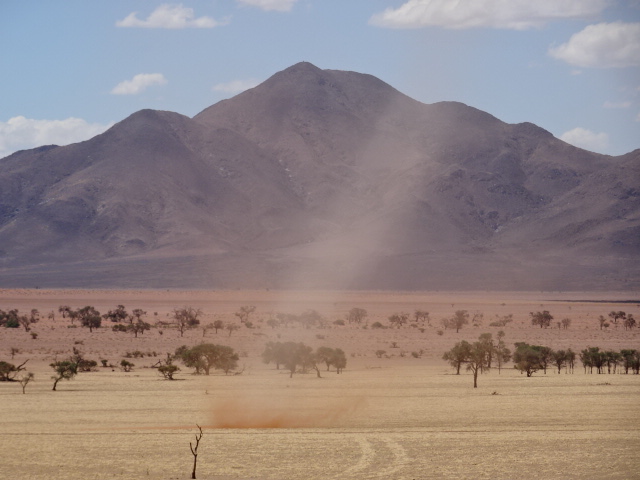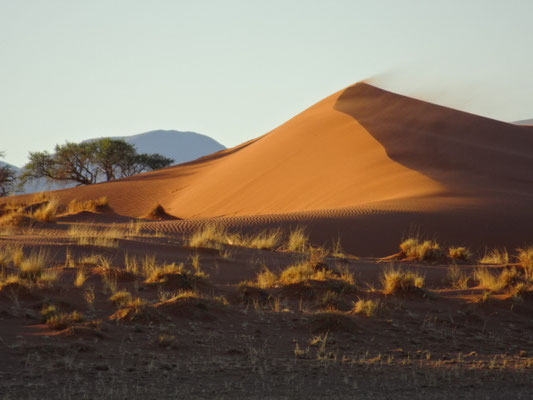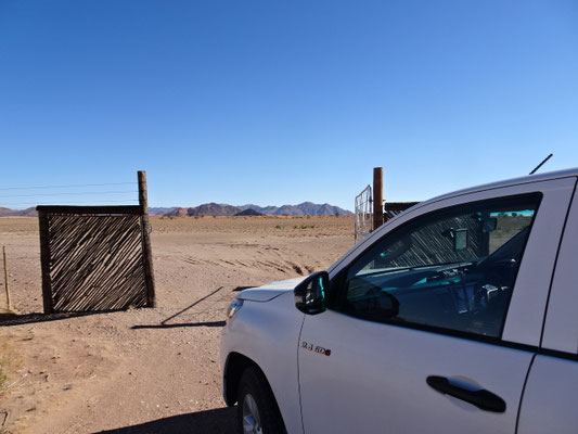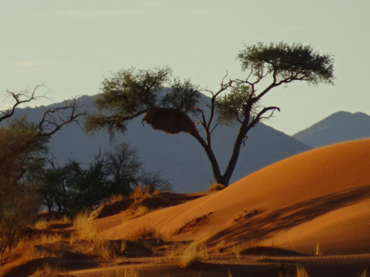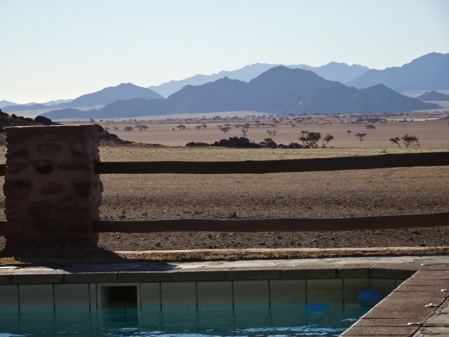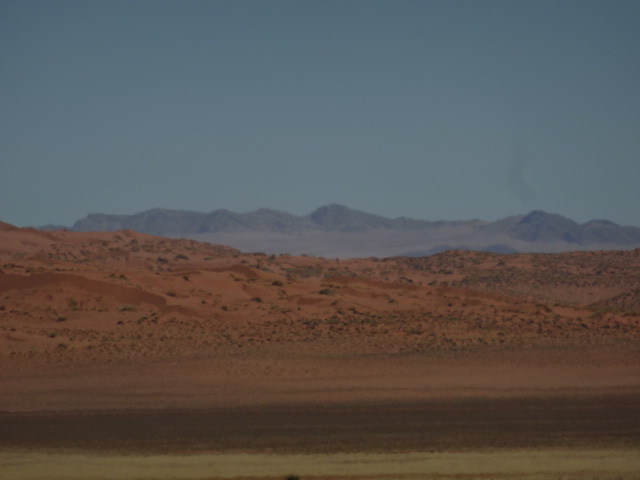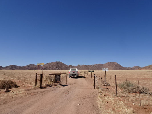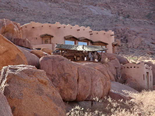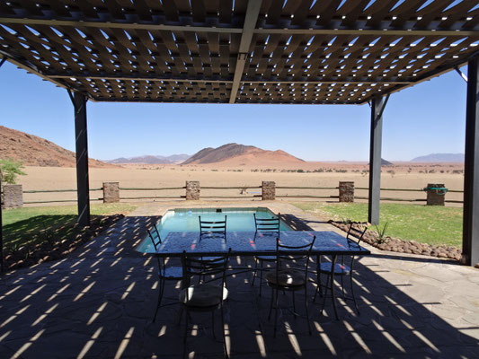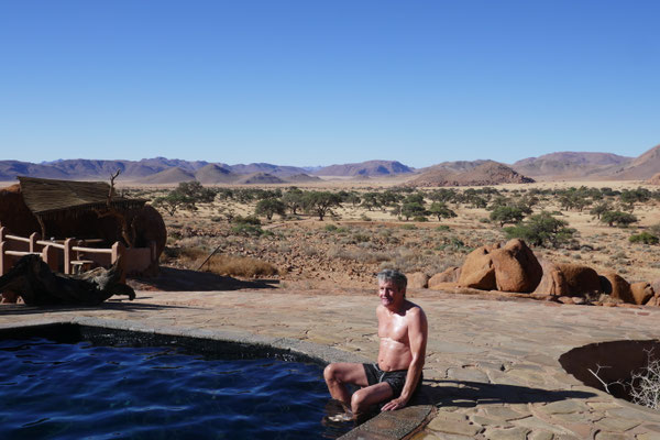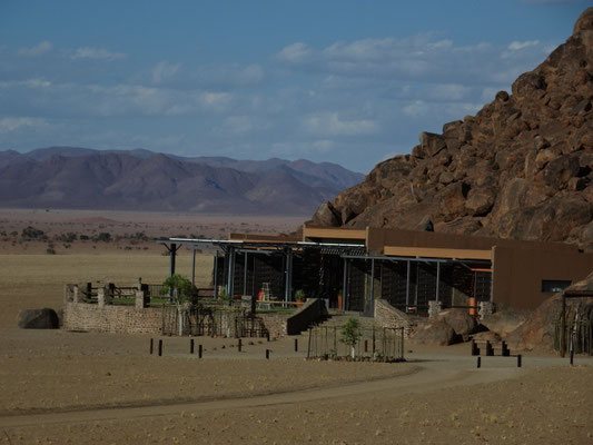 Wir lassen Windhoek gern hinter uns. Erst zu spät haben wir uns an die National Art Gallery erinnert, die wir eigentlich besuchen wollten. Schade! Die Suche nach einer Unterkunft auf unserem weiteren Wege wird zum Hindernislauf. Duwisib Castle ist unter staatlicher Verwaltung und akzeptiert nur Bargeld. Also lassen wir dieses Relikt deutscher Kolonialzeit links liegen. Eine andere Lodge wird gerade renoviert, Fehlanzeige. Dann unerwartet ein Hinweisschild: Weidetor öffnen, 7 Kilometer zum Farmhaus fahren, dort wird eine Lodge mit 6 Zimmern verwaltet. Klappt, wir sind die zweiten Gäste. Traumhafte Lage! Freundliche Servicekräfte. Südafrikanische Eigentümer. Die Tagesetappe hat sich gedehnt, Entspannung bei super Abendessen und traumhaften Farben, Formen in der Umgebung. Einsamkeit, Stille, kaum vorstellbar; die Farben ändern sich mit dem Sonnenstand ständig. Wir können uns gar nicht sattsehen. Oryxe kommen zum Wasserloch direkt vor der Veranda und laufen dann mit aufgewirbeltem Staub um die Hufe wieder in die Weite weg. Und als das letzte fahle Licht der Sonne verschwunden ist: wieder dieser so überaus reichhaltige afrikanische Himmel.