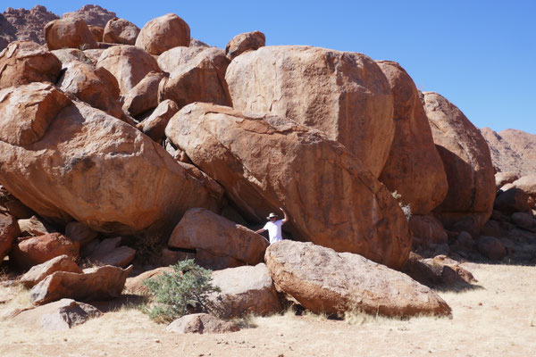 Wir fahren zum 15 Kilometer entfernten Köcherbaum Wald. Am Hand finden wir verstreut Köcherbäume, die Hälfte hat die Äste verloren, die liegen im Geröll. An der anderen Hälfte ist auch nicht viel dran. Ein Schädling bohrt feinste Löcher in die Blätter, die verlieren dadurch die Feuchtigkeit und der Baum geht ein. Ein Schädlingsbefall wohl an Köcherbäumen im ganzen südlichen Afrika.