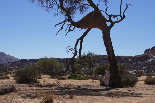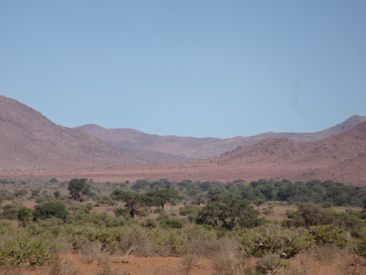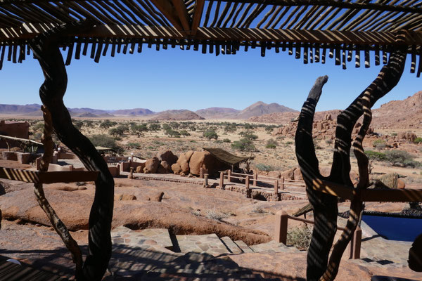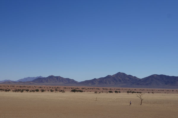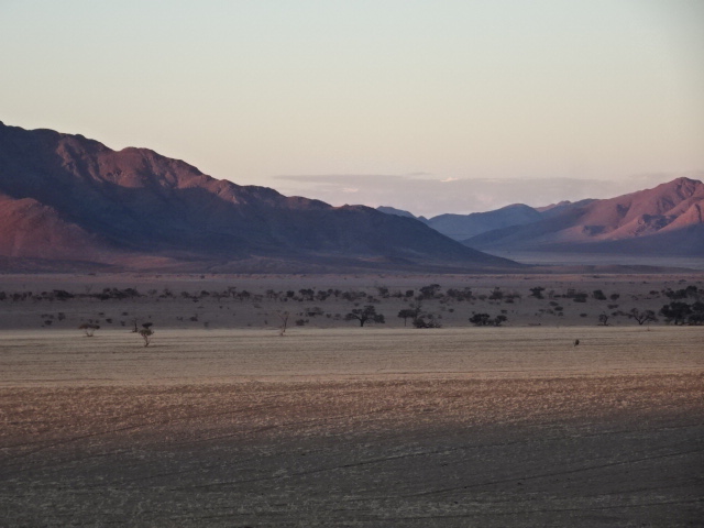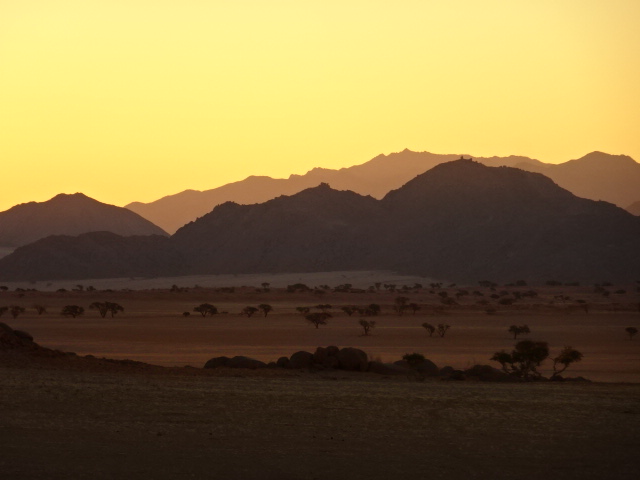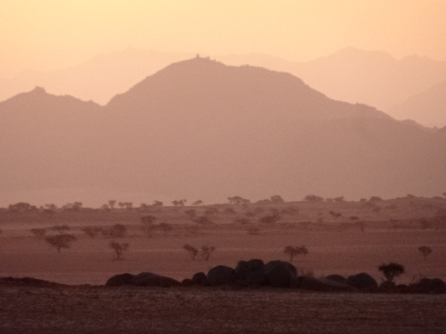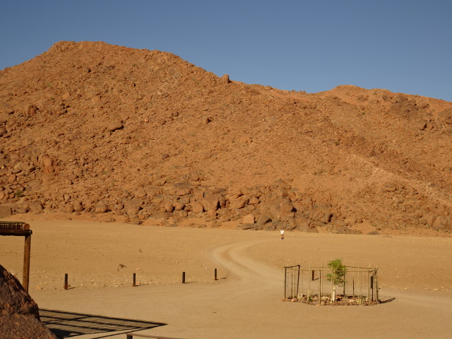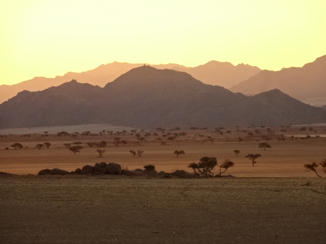 Beim Aufwachen bewundern wir den 180 Grad Blick aus dem Fenster und von der Veranda. Die Nacht hat die ersehnte Abkühlung gebracht, da war die dicke Zudecke willkommen. 6 Uhr morning drive mit einem Führer. Scharfe Kontraste von hell auf dunkel, von Sonne auf Schatten. Im Schatten wirken die Berge und die Felsbrocken kühl, abweisend. Das Spiel der Dazzies dazwischen läßt uns schmunzeln. Mit zunehmendem Sonnenlicht wechseln die Farben: rot, blau, schwarz hellgrau, manchmal trotz der Trockenheit ein Hauch von zartem Grün. Wenig später steht die sonne über uns, hell, heiß. Die Kontraste sind verschwunden, Berge, Geröll, Sand so weit das Auge reicht. Unten am alten Flußlauf eine Reihe von Kameldorn Bäumen mit ihrem Holz, das viel härter als Eichenholz ist, das sich kaum bearbeiten läßt, an schon mancher Bohrer heißgelaufen ist.