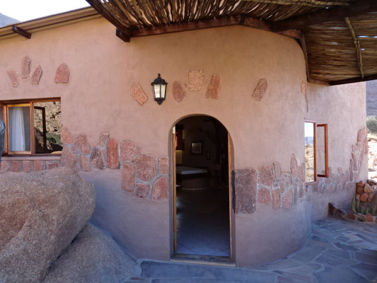 Langsam geht der Tag zur Neige. Die Lodge hat Solarstrom und eigene Wasserversorgung. Kein w-lan, keine Mobilfunkverbindung. Wer unbedingt will, kann unten, am 2 Kilometer entfernten Farmhaus die w-lan Verbindung nutzen. 19.30 Uhr versinkt die Sonne hinter einem Berg. Im fahlen verbleibenden Licht erscheint die Landschaft hell-/dunktellila, rot, orange unter einem tiefblauen Himmel. Garniert mit absoluter Stille. Die anderen Gäste sind abgereist, neue Gäste kommen erst morgen. Wir sind allein, das Personal ist nach Hause gegangen, wir geben uns dem Zauber der Stimmung hin. Uns überwältigt die Gesamtheit der Eindrücke, die Weite, die Farben, später dann die unendliche Anzahl von Sternen und die Formen der schwarzen kahlen Berge im fahlen Restlicht. Die Nacht fällt tiefschwarz aus.
