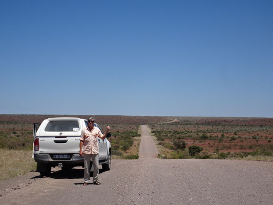 Die ganze Nacht über hat ein kühler Wind durch unseren Bungalow geweht, angenehm, gut geschlafen. Wolkenloser, kobaldblauer Himmel am Morgen. Wir erkunden zwei Stunden lang einen Teil des 20.000 ha großen Farmgeländes, von dem Roland den Boden für die Fest Inn Fels Lodge gepachtet hat. Der Urgroßvater des in Namibia geboren Farmers war mit der Schutztruppe nach "Deutsch Südwest Afrika" gekommen und hatte damals schon Land gekauft. In den letzten fünf Jahren mußte die Viehzucht (Strausse, Rinder, Pferde) eingeschränkt werden, das wenige Gras vertrocknete. Dafür hat der Farmer eine Geflügel und Vogelzucht aufgebaut.