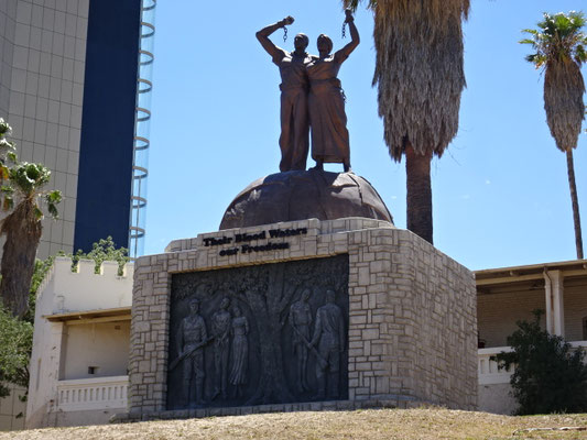 Wir sind zum Independance Memorial Museum gefahren. Mit 4 Jahren Verspätung 2014 von den Nord Koreanern fertiggestellt. Drei Stockwerke Erinnerung an den Freiheitskampf der Namibier. Mal eine drastische Gegendarstellung zu unserer Geschichtschreibung. Ganz oben in luftiger Höhe ein Restaurant mit tollem Rundumblick, Windhoek in einem weiten Tal unter uns. Wir treffen fünf andere Besucher, diese Geschichte hier ist nicht populär.