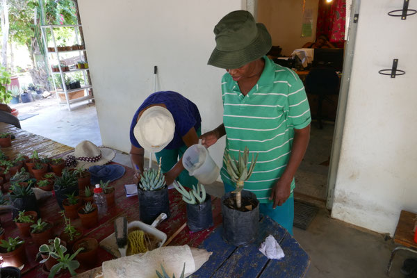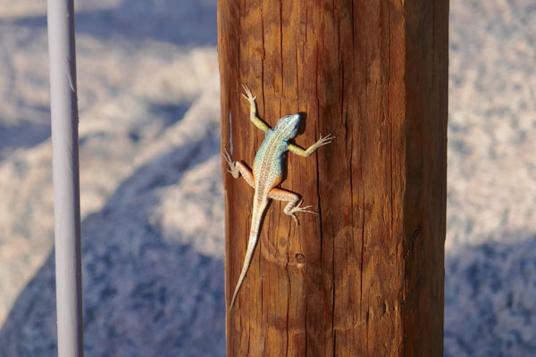 10 Kilometer vor Augrabies finden wir die kleine Baumschule wieder, bei der wir vor zwei Jahren eine Köcherbaumpflanze gekauft hatten. Die ist in Braunschweig gut angegangen und langsam gewachsen. Deshalb muß nun ein zweiter Köcherbaum mit ins Gepäck. Wir finden am Ende drei Pflanzen und bekommen dazu ein Permit, damit der offizielle Erwerb dokumentiert ist und wir die Pflanzen ausführen dürfen. Wir erreichen Augrabies bei 41 Grad, finden einen passenden Bungalow und schmeissen die Klimaanlage an. Draussen toben die Dazzies zwischen den Felsen und die Affen sind auch nicht weit. Wir fühlen uns total wohl.
